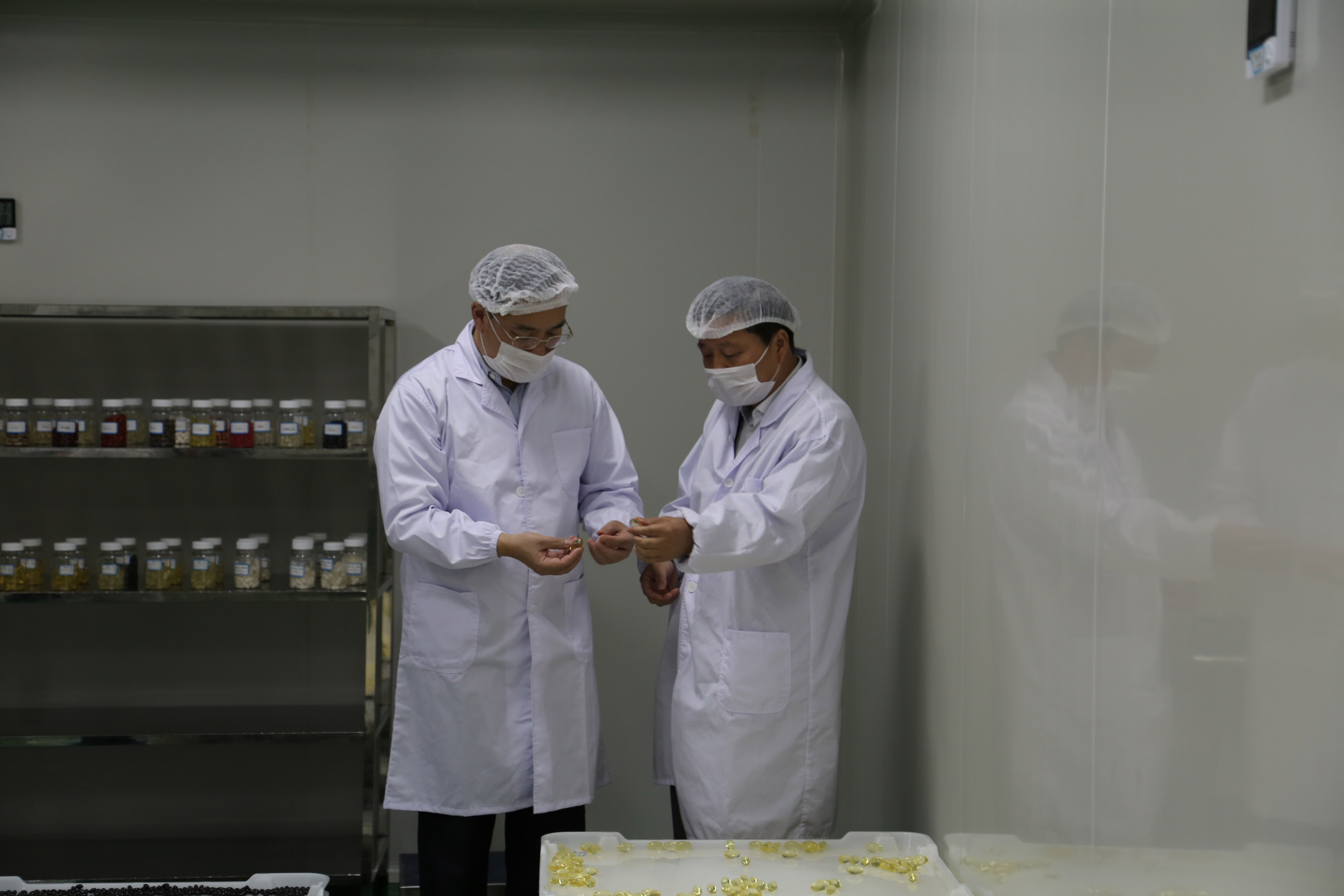秦裕輝書記仔細查看爾康制藥淀粉軟膠囊樣品